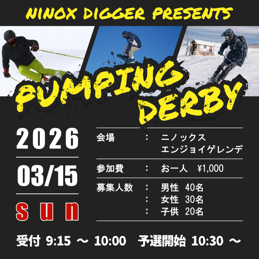 ・当日の参加者受付はエンジョイゲレンデ中腹のパンピングダービーレーンのスタートテントで行います。
